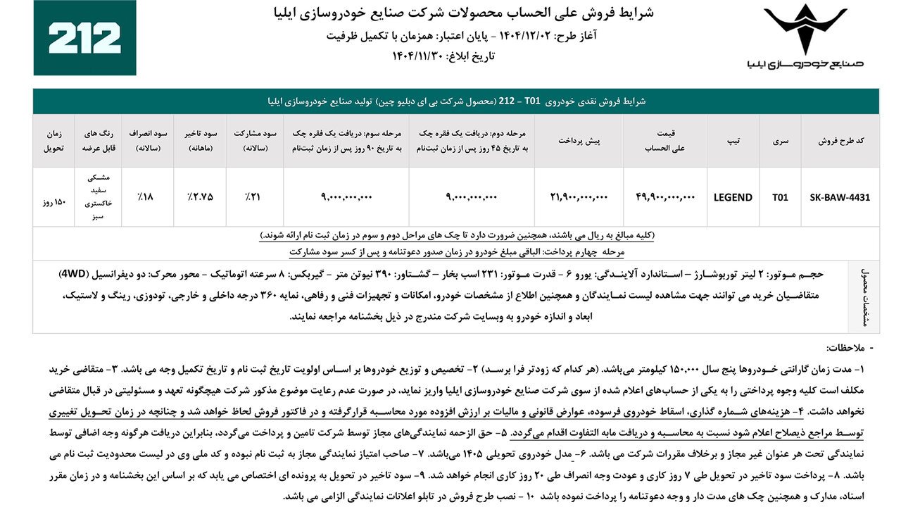 عقیل مصطفایی، معاون بازاریابی و فروش صنایع خودروسازی ایلیا (ایلیا موتور)، از آغاز مرحله نخست فروش خودروی آفرود و لوکس ۲۱۲ T01 تیپ لجند خبر داد. این خودرو که شهریور امسال در نمایشگاه خودرو مشهد رونمایی شد، از شنبه ۲ اسفند ۱۴۰۴ به صورت نقدی و در دو مرحله پرداخت عرضه میشود.